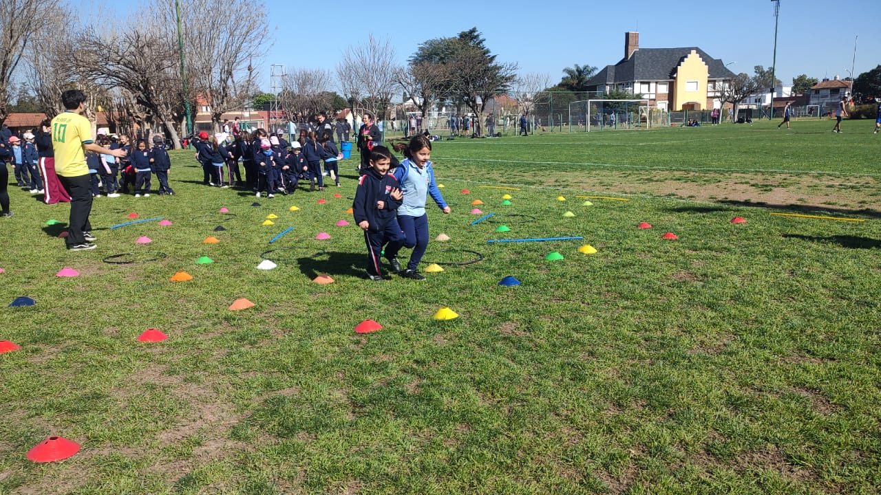 Otro de los juegos fue una carrera en duplas, donde cada pareja debía esquivar conos. La actividad requería que cada equipo se pusiera de acuerdo para completar el recorrido. El objetivo principal era que los niños trabajaran en equipo de manera coordinada lo largo del recorrido.